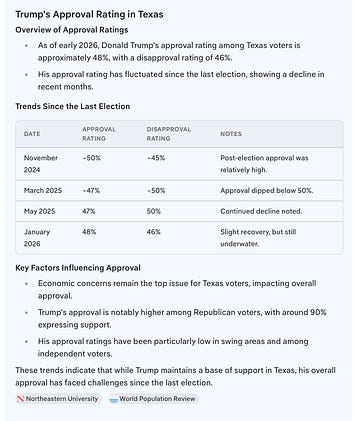 Strange isn’t it, with a 32% change in Texas Democrat vote when compared to that of the 2024 election with Harris, you would expect the approval rating for Trump and Governor Abbott to be massively changed. But no, just 2-3%.