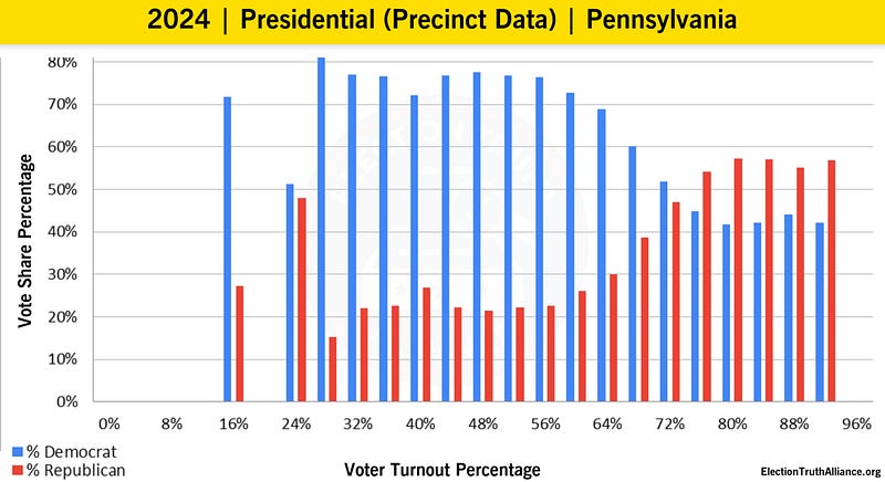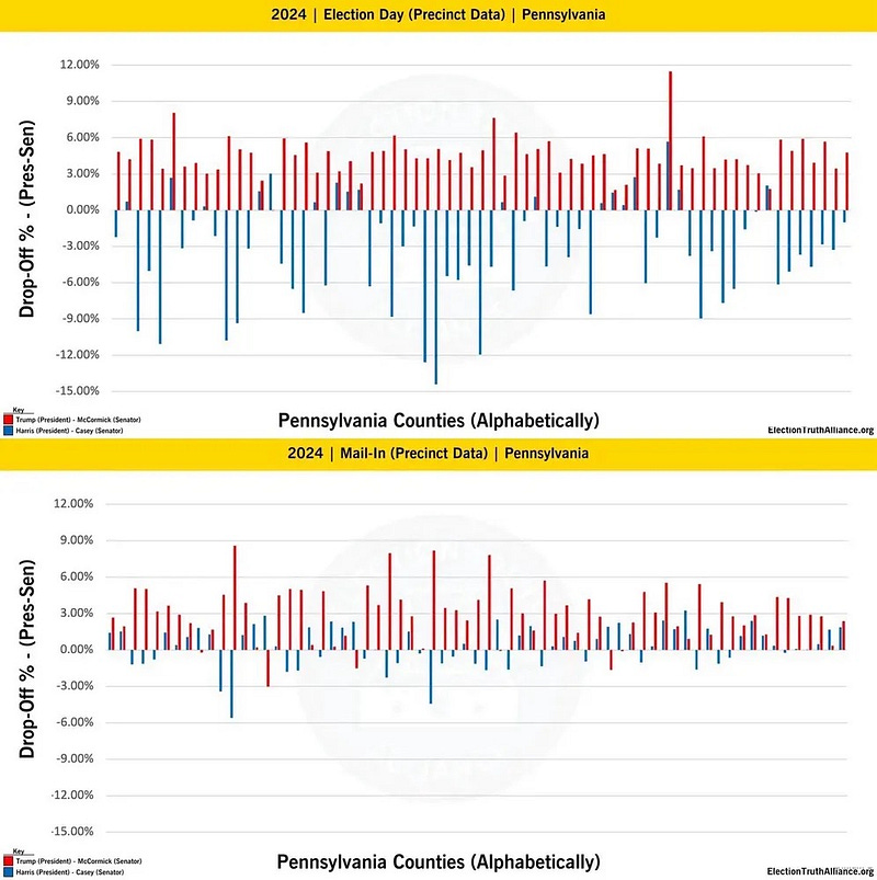 Ask yourself, why Pennsylvania voters on election day 2024 voting Democrat for the Senate switch to voting Trump for President, but this “behaviour“ didn’t occur with those mail-in voting?