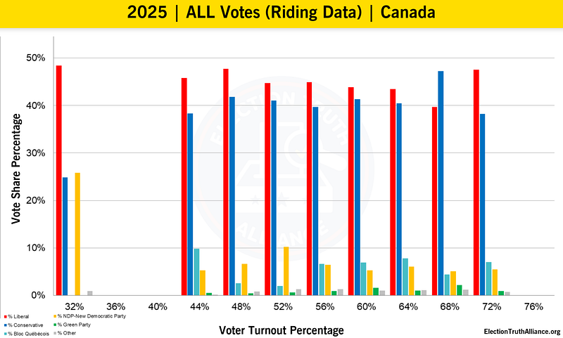 Clue: computerised tabulators that other democracies have banned or refuse to even contemplate using instead of scrutinised hand counting. See ETA’s histogram of Canadian voting percentages across turnout from hand counting votes (clue: no change across turnout levels)