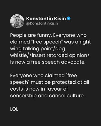 Many on the woke left are cheering on, celebrating or justifying murdering those who don’t agree with them. As much as I admire @KonstantinKisin , I really don’t care about the free speech rights of people who want people on my side to have their lives destroyed or worse murdered.