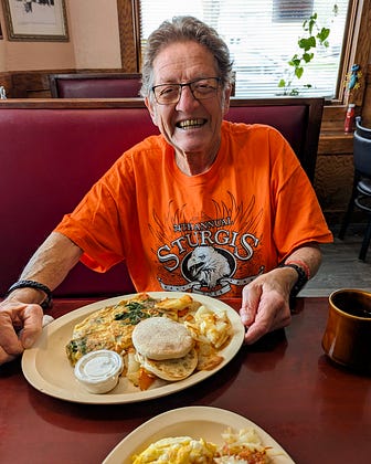 A favorite long-time ritual: breakfast with my Dad. We've been doing this for years, catching up over coffee and eggs. These days, I buy — one of those unexpected joys you discover as you grow up. I took him out again yesterday to the diner he loves in my hometown, and he told me a few more stories from his vast bank of memories. He's 77 today and still smiling as much as ever. I love this guy. Happy Birthday, Steve Adams!