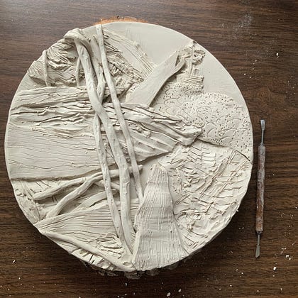 In progress: clay relief plate of a part of the woods where there’s lots of fallen branches and bark. Having a lot of fun working in 3d :)