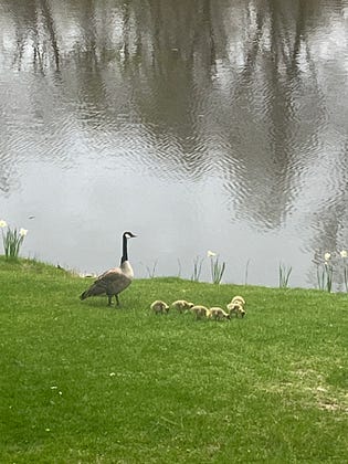 I am a mom and I still have my mom. But to me, the coolest thing about Mother’s Day is observing the wild mamas and babies in my backyard. The robin bringing worms to her hatchlings in the nest she built at the top of my downspout. The turtle who comes up out of the lake and labors for hours digging a hole in my lawn and laying her eggs, then burying them. The fluffy yellow Canada Goose goslings parading around with mom and dad, knowing instinctively how to peck for food. Mallard ducklings, too - seven swimming in a perfect line in mama’s wake. These mamas nourish my soul as they so beautifully exemplify love and nurture and faithfulness.