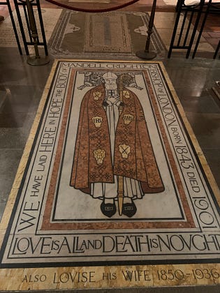 I visited the crypt of St Paul’s Cathedral recently, and saw this striking orange and black marble ledger stone to Mandell Creighton, Bishop of London 1897–1901. Just visible is the engraving ‘And Louise His Wife…’