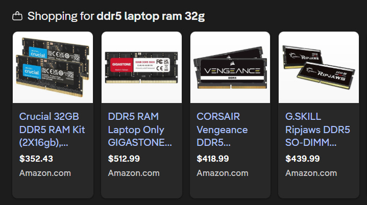$400 for 32 gigs of Apple’s non-upgradeable ‘integrated memory’ was a JOKE back when you could get 32 gigs of DDR5 laptop ram for $160 & desktop ram for $120. But now that it’s like $350-500 for the same laptop kit…