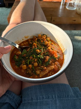 Dinner in my lap: last night’s turkey, tomato, chickpea, and air-fried broccoli stew soup situation. I added some arugula tonight. That’s pretty much it! I think I forgot to share this last night but the one exciting thing here is that I went totally crazy with herbs from the garden (thyme, rosemary, basil, parsley, and sage) and it was just fantastic. Tomato base was all thanks to Rao’s. So it was really just a matter of sauteeing a block of frozen ground turkey, air frying some broccoli, opening a can of chickpeas, and tossing it all together. You could definitely add rice or couscous or noodles but I am extremely full after eating a big bowl of this. Also, more room for dessert!