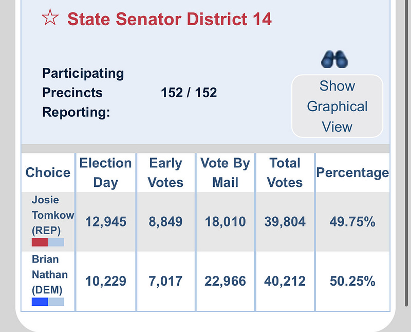 We flipped Florida State Senate district 14 by 408 votes! The new senator will be democrat, Brian Nathan!