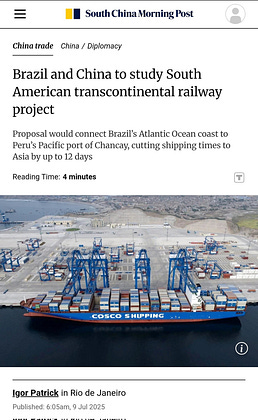 This would be huge: Brazil and China are studying the construction of a 4,500km long South America transcontinental railway that would run from northern Brazilian state of Bahia, cross the Andes, and reach the Chancay megaport near Lima, built with BRI funding.