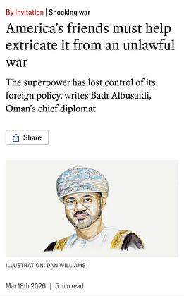 Interestingly, given he is one of Iran's neighbors and given that Oman has been struck multiple times by Iran since the war began (en.wikipedia.org/wiki/2…), he writes that "Iran’s retaliation against what it claims are American targets on the territory of its neighbours was an inevitable result" of the U.S.-Israeli attack. He describes it as "probably the only rational option available to the Iranian leadership."