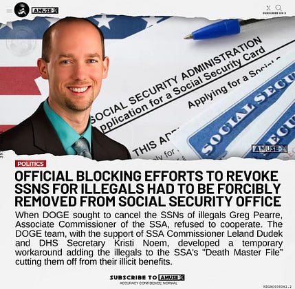 DOGE: Federal agencies like the Social Security Administration are filled with Democrats who believe it is their duty to resist President Trump's agenda. Associate Commissioner Greg Pearre opposed Trump's effort to revoke SSNs for illegals and was actively subverting the DOGE team. Security was eventually required to forcibly remove him from the building after he placed on administrative leave.