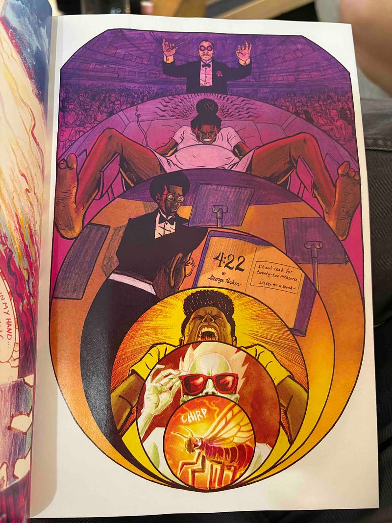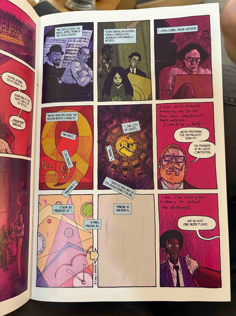 It’d be easy to chalk Spectrum up as an “artist book,” but to do so would be off-base and disregard Quinn’s contributions and eagerness to write to the comics medium. This is not a narrative that Chisholm found interesting ways to express; rather, it’s a project that has clearly been ideated as a comic from jump. This fact is evidenced by the book’s pacing and plot – which is distinct from standard three-act structures – as well as the way in which the book’s most breathtaking layouts are deployed. They are always of the narrative, contributing to the overall effect, such that they must have been ideated alongside the story.