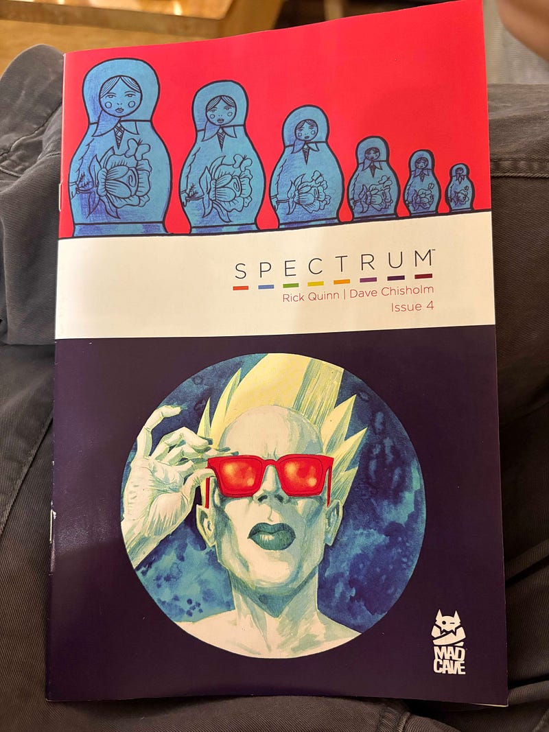 Spectrum continues to be my favorite comic on the racks, due to its insistence on actively engaging with the comics form at every turn. A huge part of this is tied up with Chisholm handling colors and letters himself, affording him complete control of the page and the opportunity to use color and letter – not merely as a stage in the assembly line – but as essential narrative tools.