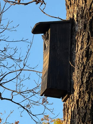 Last year I gave my neighbor an owl box for his 76th birthday. Yesterday we were drinking cognac in his backyard and I spotted an occupant!! 🦉