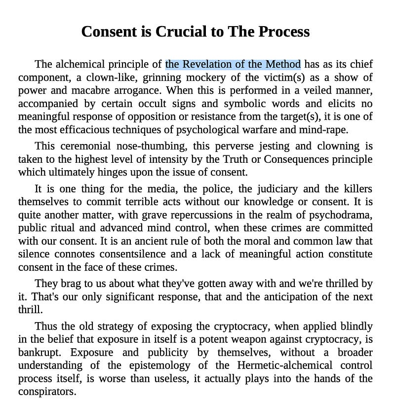 Michael A. Hoffman beschrieb es in seinem Buch „Secret Societies and Psychological Warfare“ als 'the Revelation of the Method', zu Deutsch „die Offenlegung der Methode“: Man verrät, was man macht, und wie man es macht, und konditioniert damit das Massenbewusstsein hin zu einer neuen Realität. Die dadurch erzeugte Ohnmacht ist eine weitere bewusste Demütigung, Machtdemonstration, und Verstetigung dieser Macht. Er spricht von einer „clown-like, grinning mockery of the victims“ – einer clownesken, grinsenden Verhöhnung der Opfer.