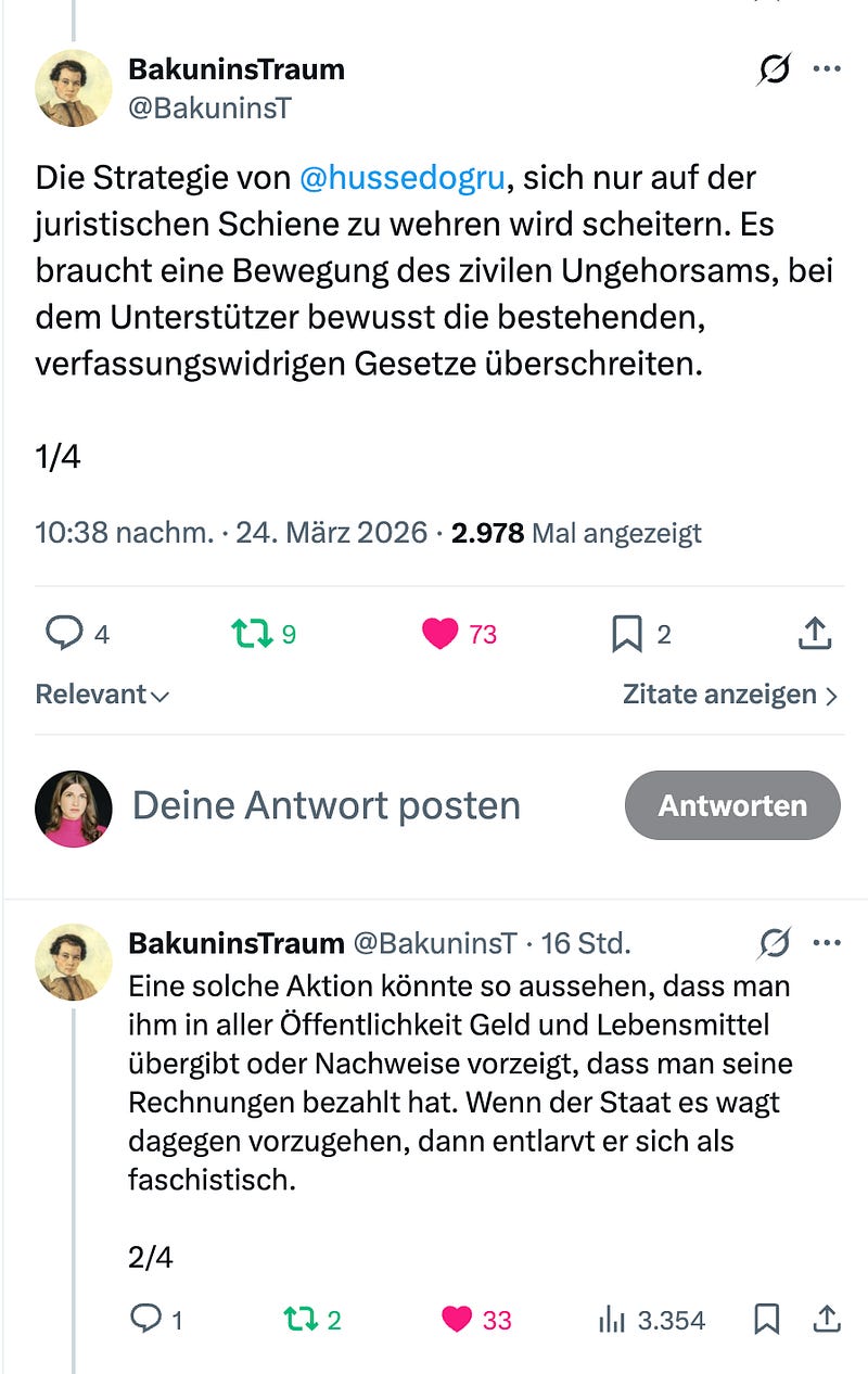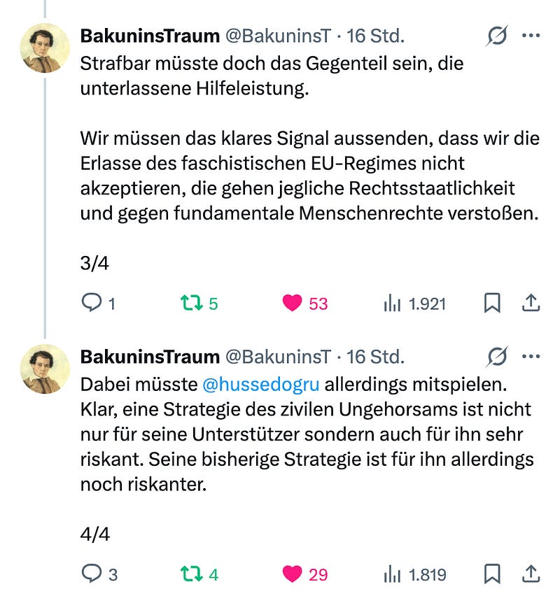 Der X-User "Bakunins Traum" hat in meinen Augen den erfolgversprechendsten Vorschlag zum Kampf gegen das faschistoide EU-Sanktionsregime gemacht: Offener ziviler Ungehorsam, indem Dogru vor laufenden Kameras Lebensmittel und Geldspenden überreicht werden. Dass über den juristischen Weg nichts zu erreichen ist, wurde nun hinreichend bewiesen. Nun geht es um die blanke Existenz einer 5-köpfigen Familie - hier ist Notwehr angezeigt.