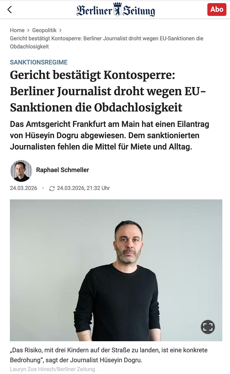 In der Berliner Zeitung erschien ein neuer Bericht über den Fall des Journalisten Hussein Dogru, der aufgrund seiner propalästinensischen Berichterstattung vom EU-Rat sanktioniert wurde. Dogru kann demnach nur noch über ein Minimum von 506 Euro monatlich verfügen - für eine fünfköpfige Familie. Aufgrund dieser Beschränkung droht seiner Familie und ihm nun die Obdachlosigkeit, weshalb er beim Amtsgericht Frankfurt einen Eilantrag zur Aufhebung der Kontobeschränkungen für überlebenswichtige Zahlungen gestellt hat - dieser wurde abgewiesen.