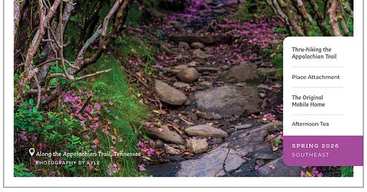 Introducing our Spring 2026 issue! Experience thru-hiking the Appalachian Trail through a first-person account, find why “place attachment” is particularly strong in small towns, discover a new meaning for mobile homes, tour afternoon tea services between Charleston and Augusta, and more.