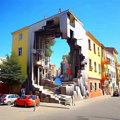 The mural shows a staircase leading to a portal that opens at a glance at a city street. The mural is known as "Stairway to the Abstract" and has become a popular tourist attraction.