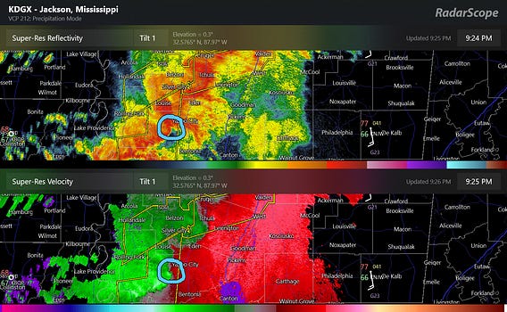 A line of severe storms is moving across the lower Mississippi Delta with an interesting rotational signature just southwest of Yazoo City.