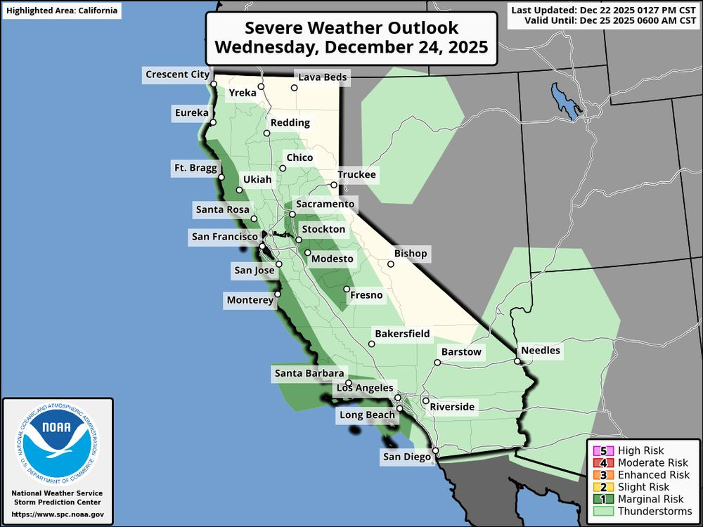 The flood threat will begin to ramp up across the state on Tuesday as a strong area of low pressure begins to develop offshore of California and move north northeast toward the Oregon/California border. This storm system is also expected to bring strong winds (potential gusts 60+ mph) to areas near the coast from central California north with strong winds also expected in higher elevations of northern California and Oregon — high wind warnings and wind advisories are in effect for many areas. Finally, a few severe thunderstorms with damaging winds and tornadoes are possible late Tuesday night into Christmas Eve along the California coast and in the parts of the central valley.