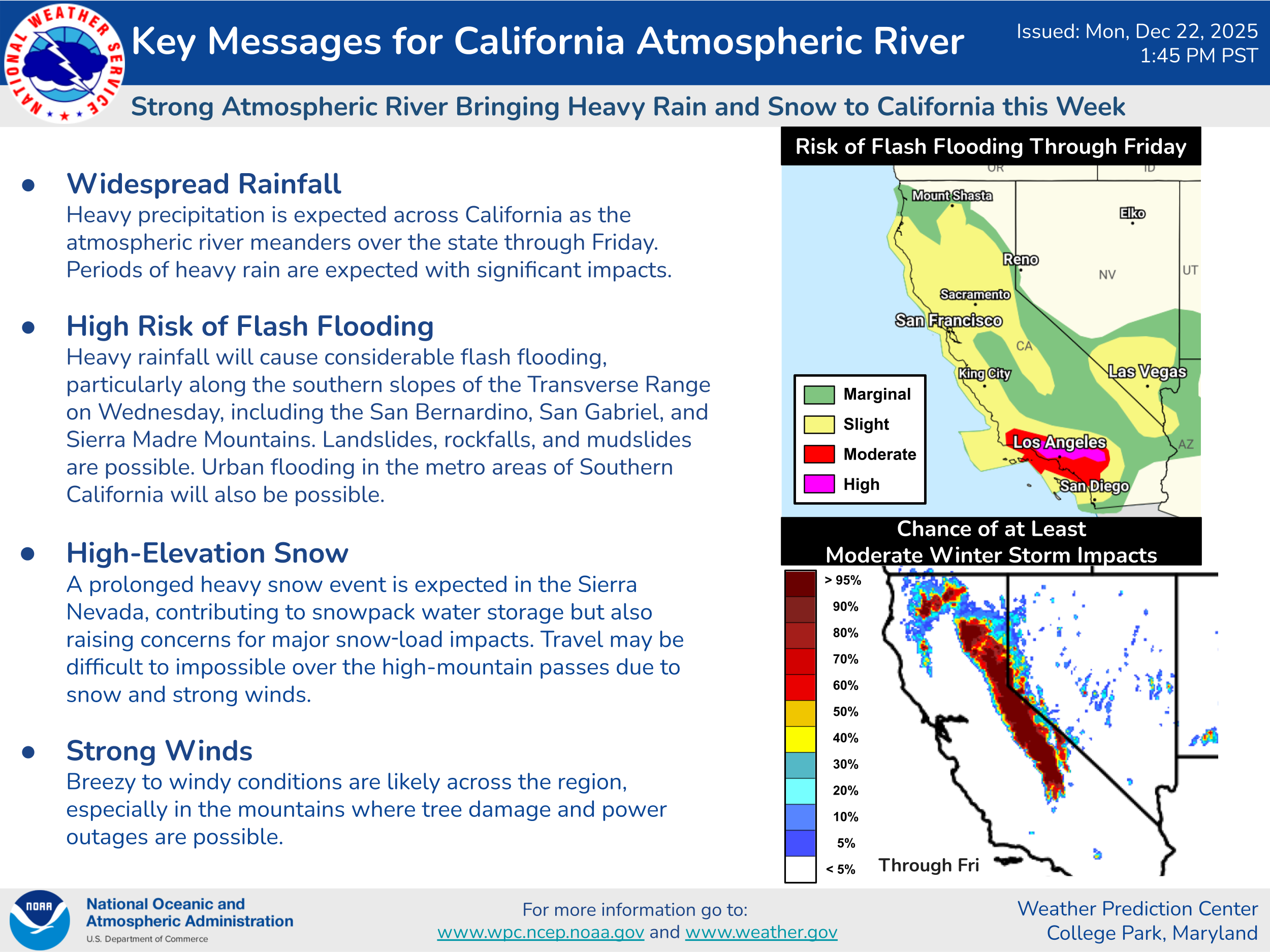 The NWS Weather Prediction Center has issued a rare day 3 high (level 4 of 4) risk of excessive rainfall and flash flooding for the Transverse Ranges of southern California for Christmas Eve, with a larger moderate (level 3 of 4) risk including most of the southern California urban corridor. WPC is calling for widespread rainfall amounts of 4-7” over an 18 hour period with isolated amounts of up to 10” which will likely cause significant urban flooding, landslides and potential debris flows in burn scar regions.