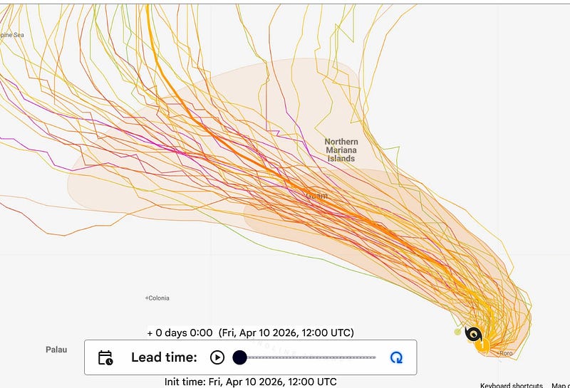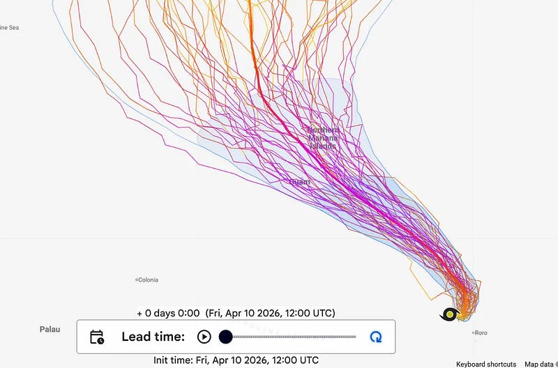 Today's Google DeepMind forecast shifted notably to the left and is now closer to the consistent European ensemble forecast for now Typhoon Sinlaku. This increases confidence that the likely powerful typhoon is likely to directly impact Guam.