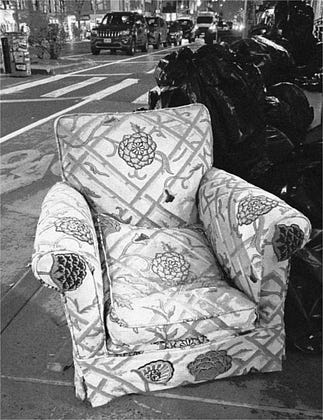 My favorite photo of 2025. Why? More the story than the picture. Walking home from an event I passed by the chair, paused, thought that’s a good companion for my fictional street couch, Blossom, kept walking. Half a block later I’m thinking am I nuts or what? not to take the photo. Turned around, got the shot, also picked up a 12-in splinter from a traffic barricade, and carried that home.