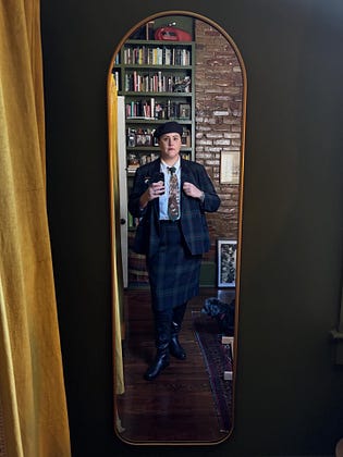 Wool suit, silk tie, brooch, and necklace all thrifted from eBay for shockingly low prices. The beret belonged to my father-in-law.