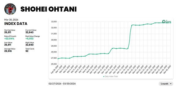 Ohtani's meteoric rise is not slowing down yet. His cards are up another 22% over the last month, per CardLadder.