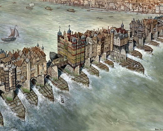Old London Bridge was the longest inhabited bridge in Europe, considered a wonder of the world. It had 138 shops and houses, even a church built on it. It was demolished in 1831.