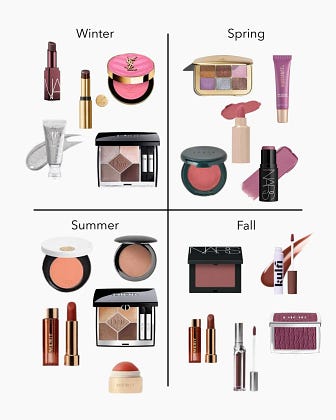 The makeup and tones I gravitate towards each season. It's a lot of vibes but it's not just vibes! My skin tone changes with the seasons from neutral/slightly warm to warm, as does my contrast. I explain more in my recent post but this graph visualizes the shades that look best on me each season.