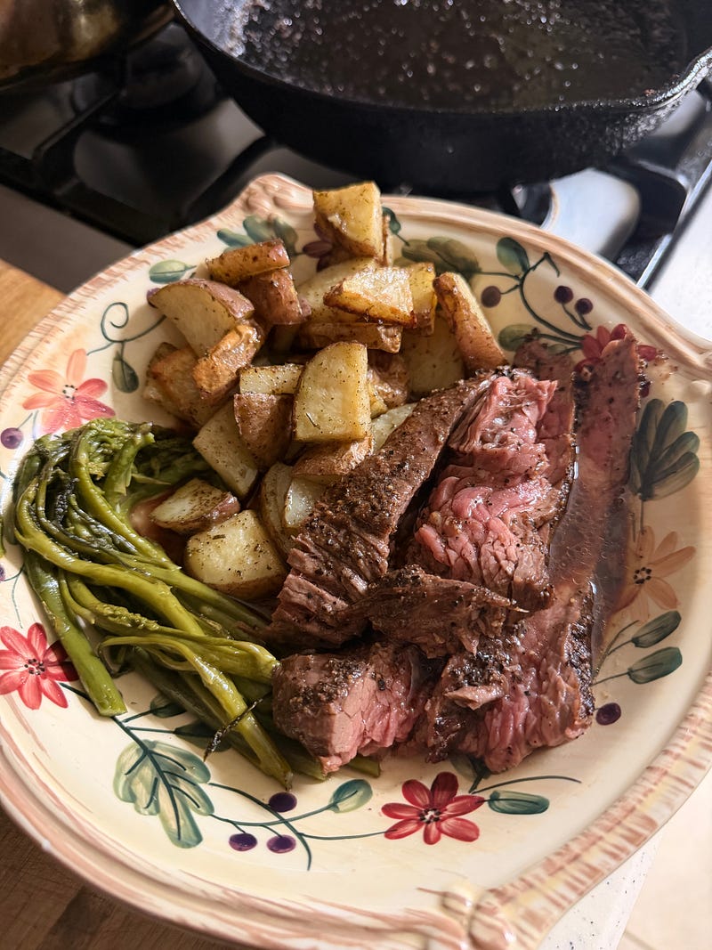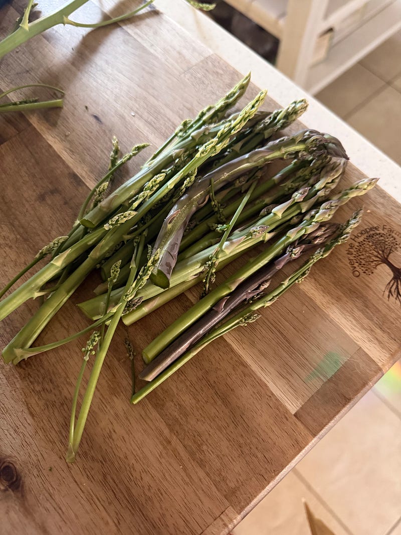 A supper like this makes me feel rich beyond any amount I have in my bank account. Asparagus from my garden and beef raised in my neighborhood…priceless!