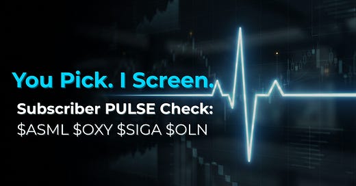 This week: $ASML, $OXY, $SIGA and $OLN. You pick the stocks. I run them through the PULSE framework on video every Friday.