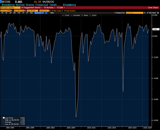 In case you are wondering about where we are in markets vs. history, this is Bloomberg’s U.S. Financial Conditions Index. It takes into account several factors, including liquidity, volatility, valuations, credit spreads, etc.