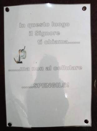 We saw this hilarious sign on the door of a church in San Giovanni Valdarno in Tuscany. The mobile phone and the tie are from a different era. The sign says