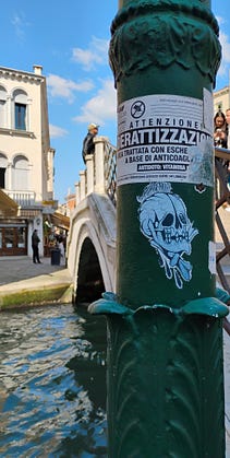 The rats in Venice are nothing to sneeze at. They run along the edges of the canals at night and are breathtakingly sizable. This sign says that the area has been deratted using an anticoagulant bait.