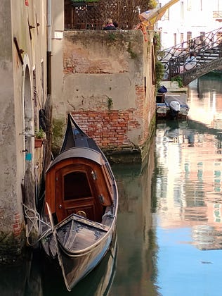 Venetian gondola with a cabin, or felze, for protection from the weather and/or for privacy (Venice, Italy)