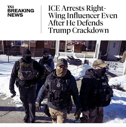 “Welp. Right wing influencer Junior Pena, whose Instagram has almost half a million followers and who immigrated here from Brazil in 2009, just got arrested. He now faces deportation. Pena has been a hardcore Trumper so I’d say it’s karma, but really it’s just this regime’s blanket racist policies.” - Jay Kuo