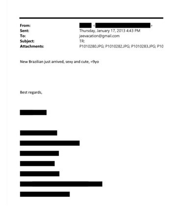 He’s informing Epstein about a “sexy cute 9 year old Brazilian child “ that just arrived ( to be raped by all the guys in the files).