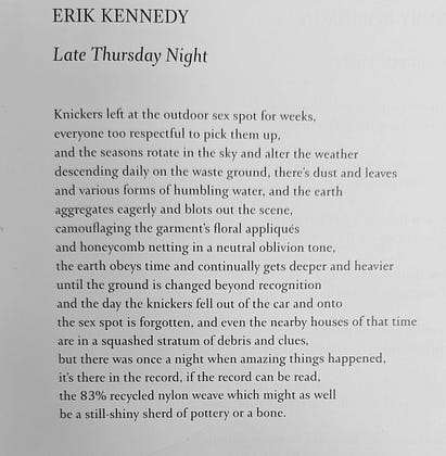 This poem by Erik Kennedy (Poetry Review, Spring 2026) gave me confidence to include an element of a poem I was working on. Can you guess how? It’s lovely when reading others sparks something.