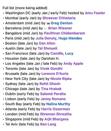 (curated gatherings for people who are openly/secretly exploring starting/joining their next thing)