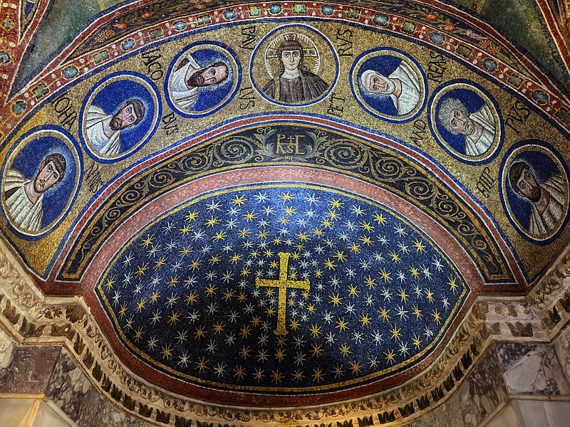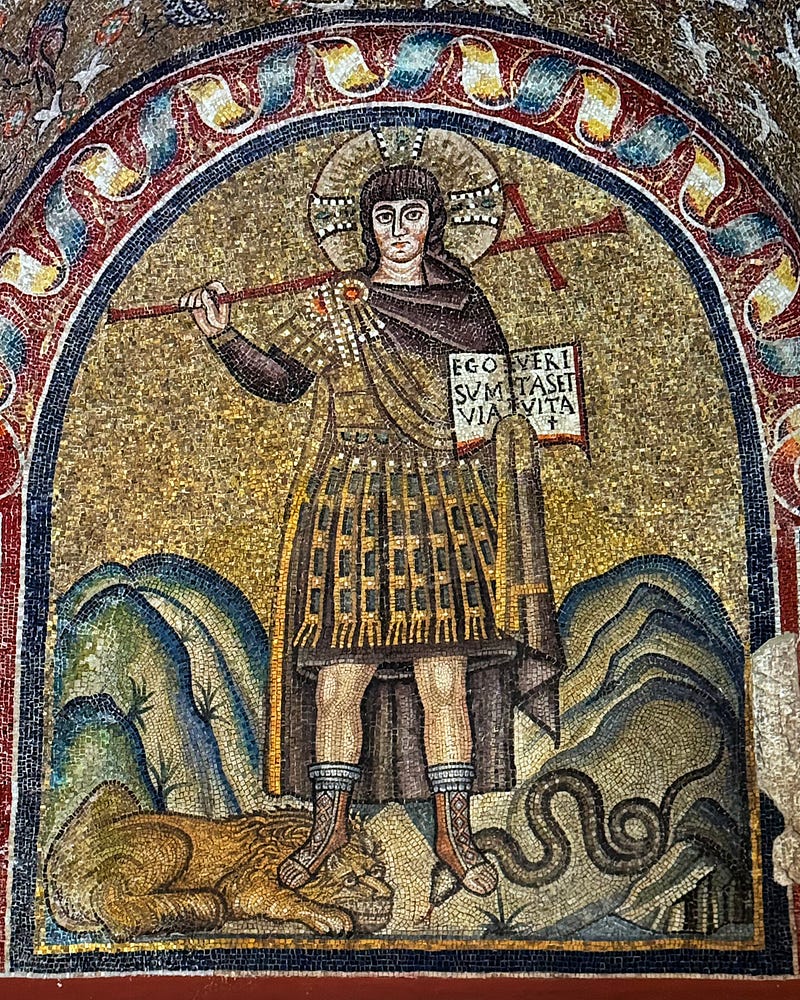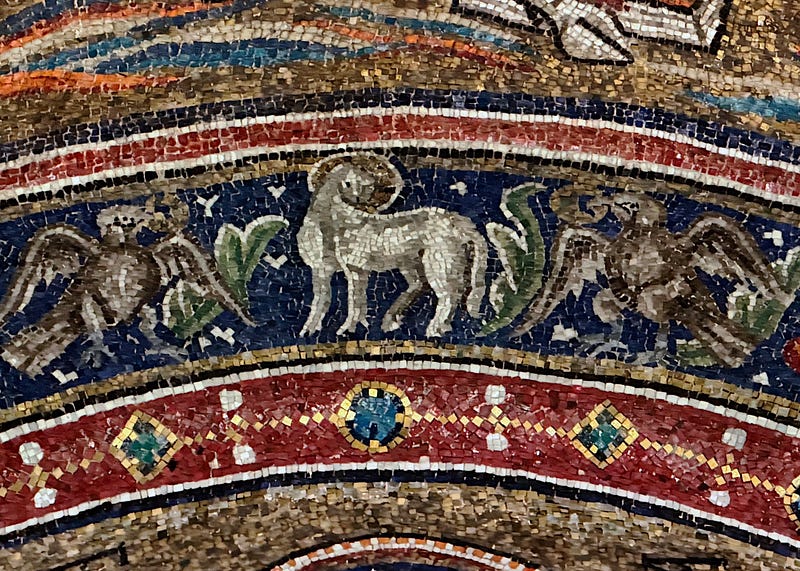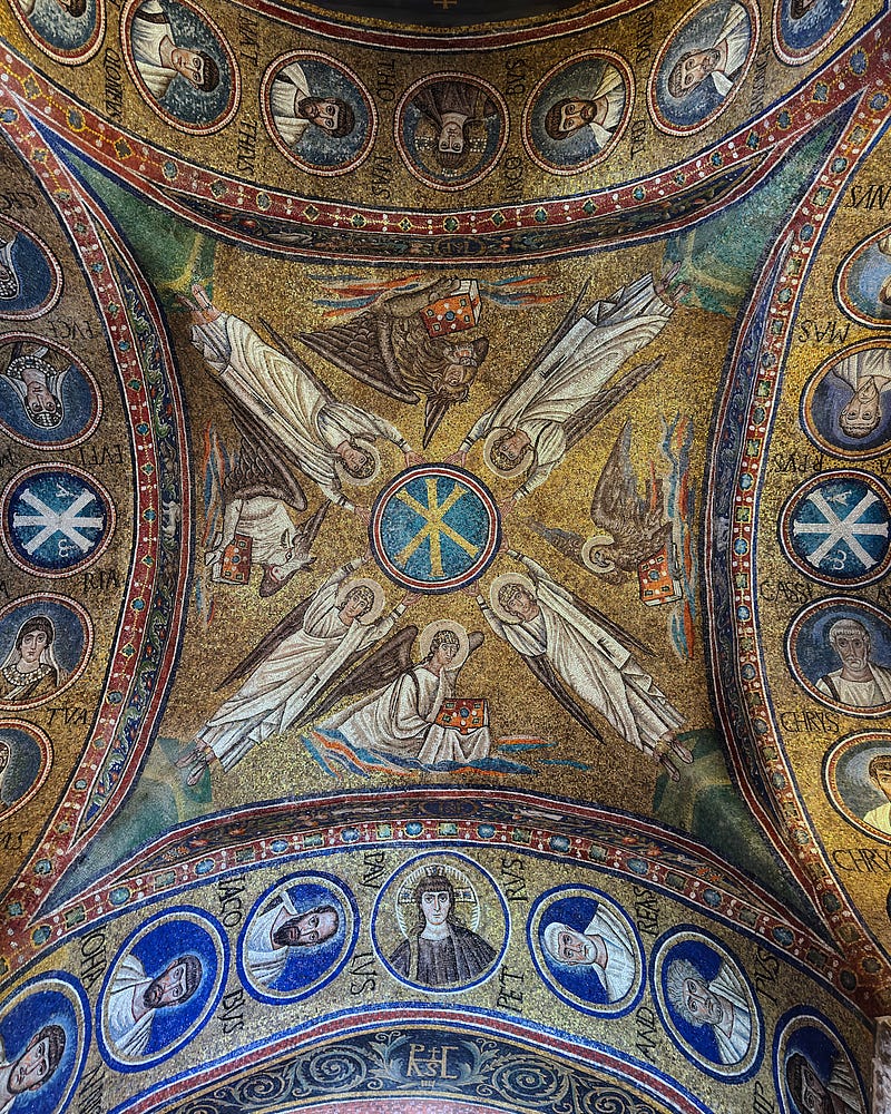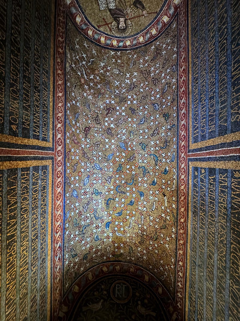 As with many of the previous places we visited in my five other Notes on Ravenna, there’s some interesting iconography going on that is decidedly non-standard today. The IX Monogram (the Greek for J and C) in the center of the ceiling, for example, was one of many Christograms in use before things settled to the standard Chi Ro (Which uses the Greek versions of C and R).
