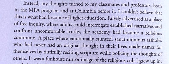 “Falsely advertised as a place of free inquiry, where adults could interrogate established narratives and confront uncomfortable truths, the academy had become a religious commune. A place where emotionally stunted, sanctimonious assholes who had never had an original thought in their lives made names for themselves by dutifully reciting scripture while policing the thoughts of others. It was a funhouse mirror image of the religious cult I grew up in.”