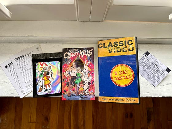 I got my Cherry Kills collector’s kit in the mail yesterday. So impressed with how clever the packaging is. J. Curtis and Sean Thomas McDonnell did an amazing job, sparing no detail. It’s a full experience all delivered in a VHS case that (I think) was recycled!
