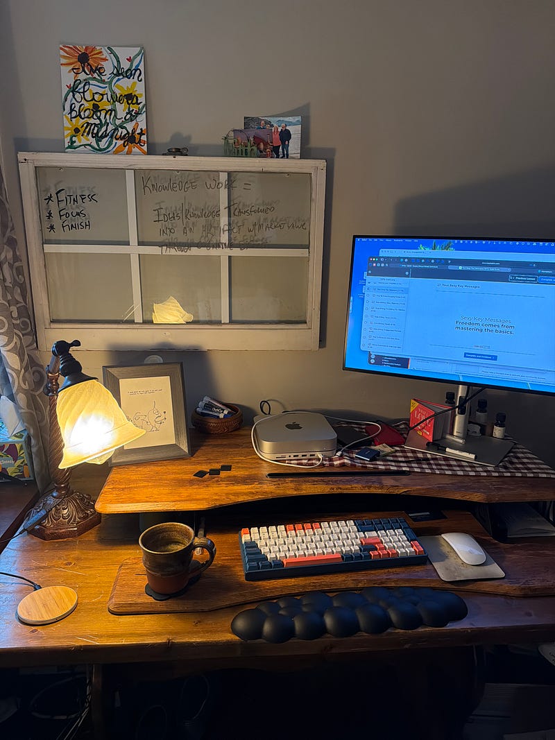 Desk 3: Computer Desk. Standing desk with Mac Mini, giant screen, clicky-clacky keyboard.