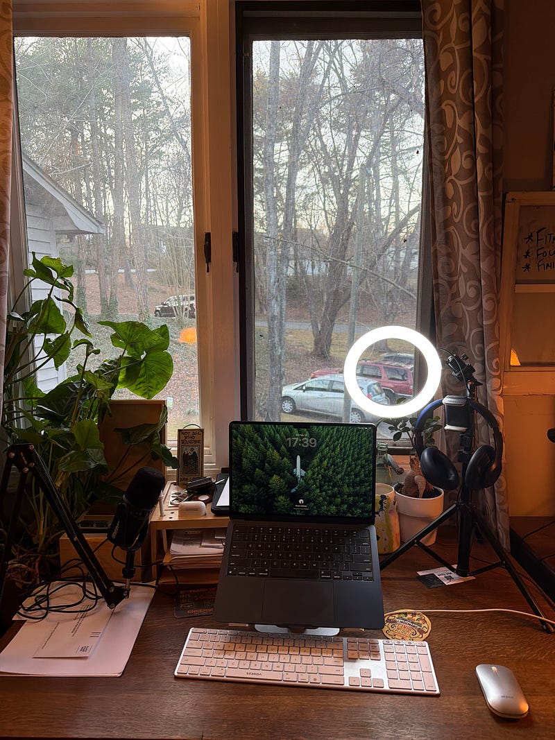Desk 2: Podcast/video call desk. Laptop, microphone, and circle light.