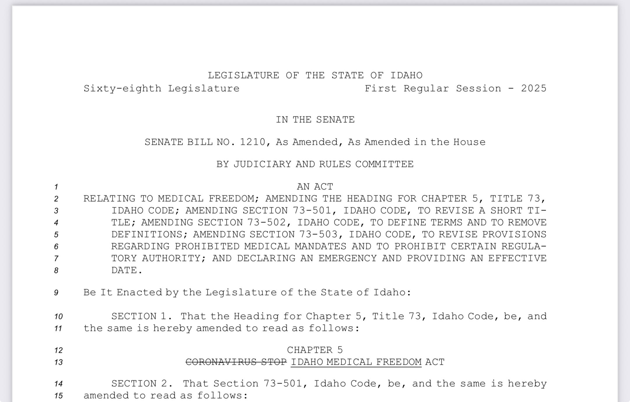 PASSED! Idaho Legislature: Ask Legislators to VOTE YES on S1210aa – Medical Freedom Act (posted 04/01/25, updated 04/02/25, update 04/04/25, 04/05/25)