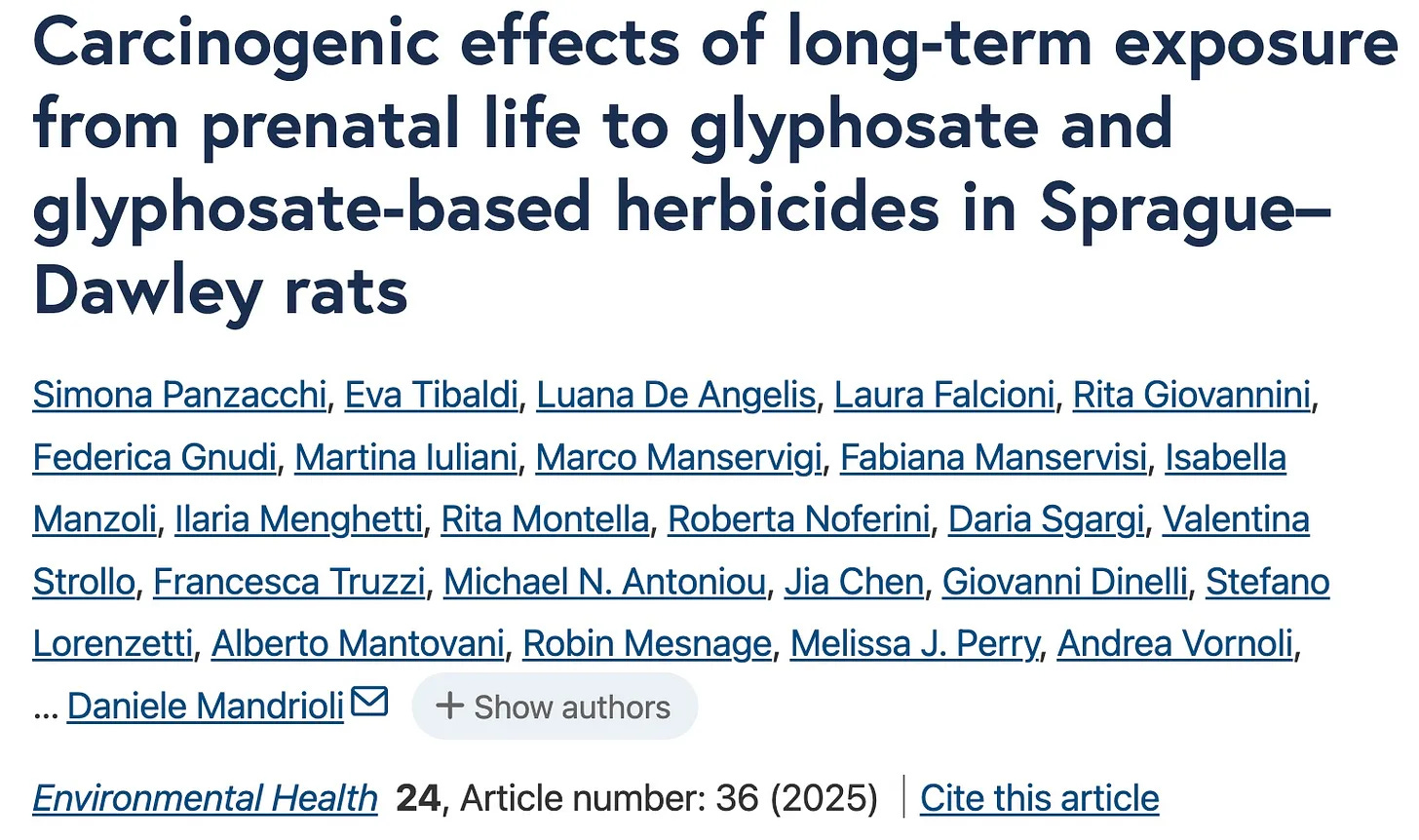 Ramazzini Institute study (2025) found glyphosate and GBHs caused dose-related tumors in rats, supporting IARC’s 2015 classification of glyphosate as a probable carcinogen.