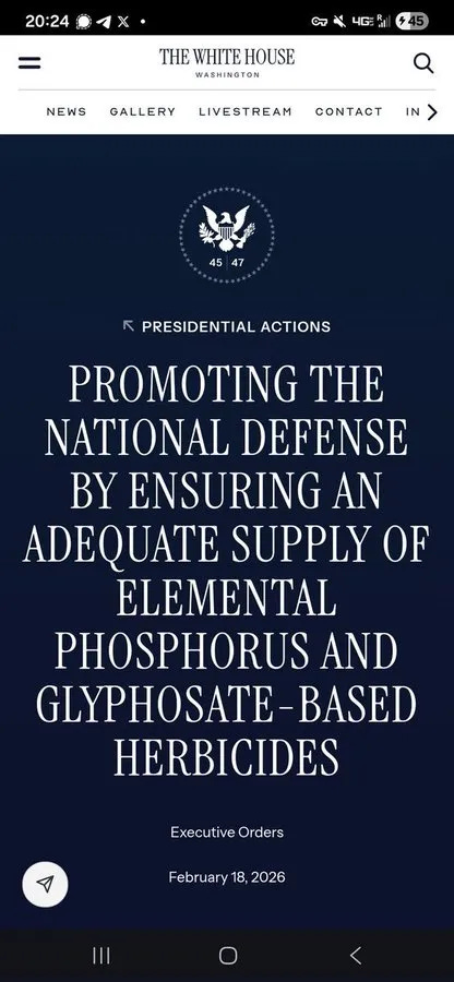 President Donald Trump signed an executive order on Feb. 18, 2026 under the Defense Production Act declaring the domestic production of glyphosate-based herbicides and elemental phosphorus — chemicals used in widely used herbicides and in various agricultural and industrial applications — as critical to U.S. national security and food-supply security. Trump stated no viable alternatives exist for efficient American agricultural production. Trump’s order to ensure an adequate domestic supply and support production triggered reactions from proponents and critics of glyphosate’s health impacts and legal liability.