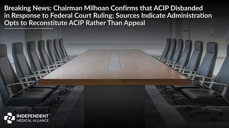 ACIP Disbanded — Chairman Milhoan Confirms that ACIP Disbanded in Response to Federal Court Ruling; Sources Indicate Administration Opts to Reconstitute ACIP Rather Than Appeal.